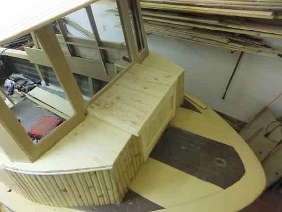 Then, as soon as I could get some of the grease off my hands, I shucked the pretty-but-too-tall domed hatch. The latest iteration is made out of narrow strips of spalted pine.