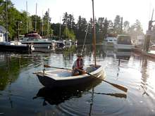 Everything but the sail was ready by the middle of April. I hauled the untried boat to the lake without any fanfare. I had to see that it sat evenly on the water. I had to know that it rowed and coasted in a straight line! Oh Yes! Success!! |