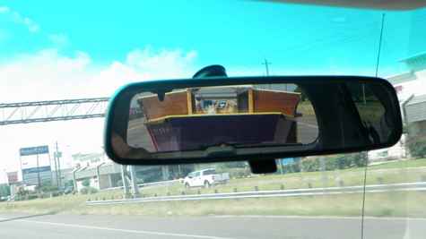 Hapscut following us in the rear view mirror of the mini-van on the way to its first sail. The front and rear walk-thru hatches are 3/8" clear Plexiglas that allows you to see thru the boat when it's on the trailer. For sailing in rough weather we slide in the front hatch and snap on a short slot cover that goes from the mast forward to the front hatch. This keeps the spray from getting inside the boat. |