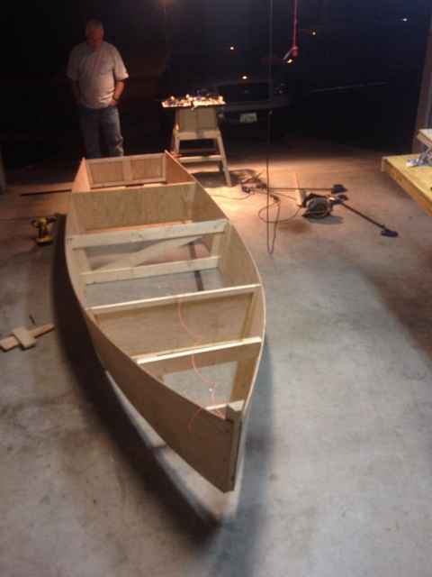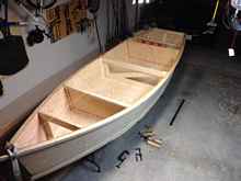 The boat was framed and needed a bottom. Instead of gluing the bottom on one piece at a time, I glue the three pieces of ½" marine plywood sheets together with two 1 x 4's. After a couple three days, I took the boat frame outside and laid the bottom over it, traced a generous line and cut it out. I screwed it down with regular drywall screws and let it set for a couple days so it could assume the rocker of the frame. Long story short, the glue went on and the screws were replaced with stainless steel exterior wood screws. I was done with the bottom!