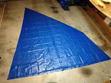 I started looking on Duckwork's for pre-made sails and sail kits and decided to make my own. After all, if you can build a boat then you can probably make your own sail, if you know how to sew. I did fortunately! I bought a cheap $20 blue poly tarp from Lowe's and laid out my pattern. I will say this, buy the book Boat Building for Beginners, it was a great resource to me on sail making. I laid out the design on the tarp and cut it out. I had to read that section of the book about three times to figure out which way to swing the radius, but I got it. Everything marked, now I was ready to "adjust the pattern". I had no idea what a "round" or "hollow" was before this but I do now. I used a batten I cut off of a 2 x 4 x16 and it worked perfectly.