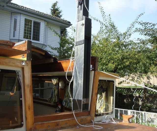 Nobody ever accused me of being a photographer. I haven't let that stop me and present here some snaps of my efforts this summer. The roof and hatches came first. They should have probably followed the tabernacle, not preceded it. However, I didn't plan on a tabernacle until the mast snapped, but that's another story. I'll get back to that later. The roof and hatches were constructed of cedar strips a la stripper canoe style with cove and bead edges. The hatches were constructed first as one large piece and then the roof section was built on top of it to get the mating curve. Next the hatch was cut into two equal length pieces. The hatches slide on aluminum angles fastened to the slot top rails. The roof is fastened with hooks on one side and loose pin hinges on the other rail. It is removable. The black coloured gaskets between the roof and the hatches were carefully designed by General Motors and came from a 2002 Oldsmobile that was languishing at Ralph's Pick-A-Part. They started life as weather strip around the doors and have proven to be effective on a boat as well.