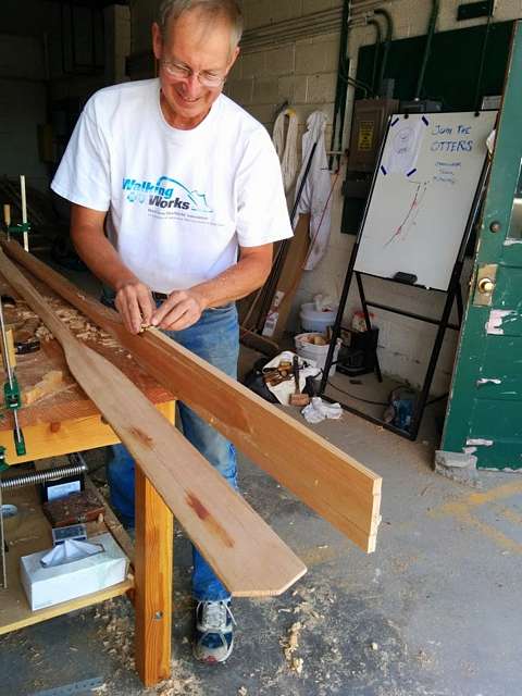 There is an ongoing debate among the clubs about length; we made ours 11' at the bow and stern and 11'10" at the middle two stations. The club rules specify no fancy metal oarlocks, and the plans show the Iron Age routh and kabe design, a pad with an upright block mortised into the rail. The oar has sacrificial wood boards (sclates) that bear on the pad and upright, and is held in place with a lanyard (humbliband in old dialect).