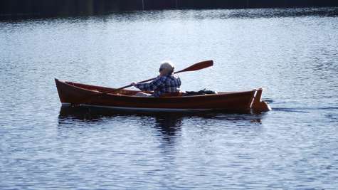 The original "piccolo" was designed and built in 1980 by Bob Baker of Westport Massachusetts on commission for the Wooden Boat Magazine who still offer detailed plans and two "how to build articles" in their magazine. The little boat is 12' 9" by a mere 2' 6" and weighs about 60 lbs; you know how small it really is when you sit in it for the first time.