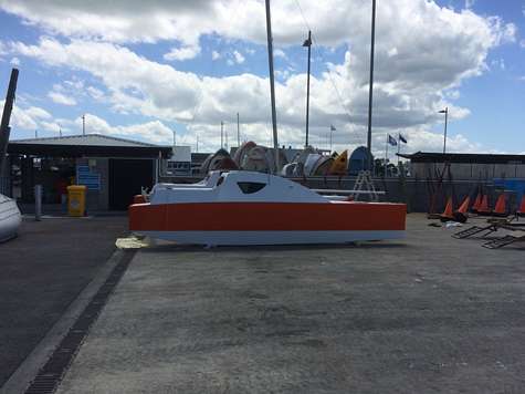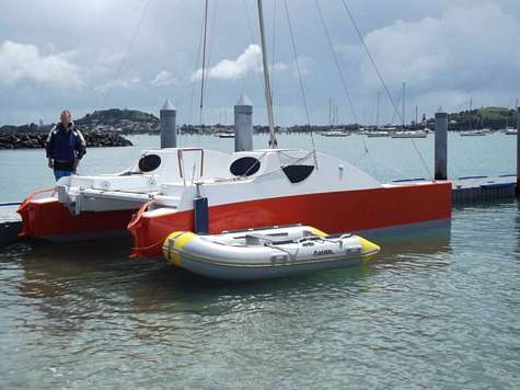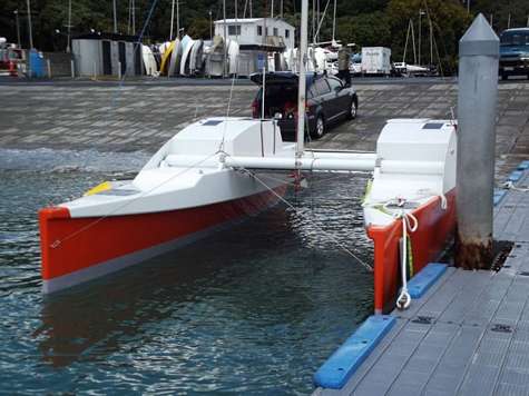 It all went ok but the weather didn't help at all. Was blowing 25 knots today, but there was a brief window of time in the morning where conditions allowed us to get it done. No sails yet but I can report that a 5Hp motor will give a cruise speed of 6.5 knots and a max of 8 knots. The slim hulls do a good job of smoothing out smaller waves. In tight manoeuvres I found being able to turn the motor a big help. While motoring the bows were often just skimming the surface of the water. With two of us on board I noticed speed was better when we avoided sitting too far aft.