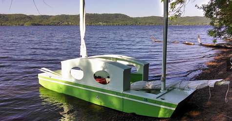 I launched and sailed Duck-Duck-Goose Friday, May 30 at the Lake Pepin Messabout! She's not quite done, but close enough to launch and sail. She sailed pretty well, especially considering it was my first time sailing with a split rig and first with a balanced lug (main). I was able to make windward progress and she didn't break up in the chop. Quite a few pops, creaks, and cracks from the pieces moving in relation to each other. I think I need to add some latches near the chines to stiffen her up a bit. I did get some nice gushers coming up between the pieces, so need to add some gaskets.