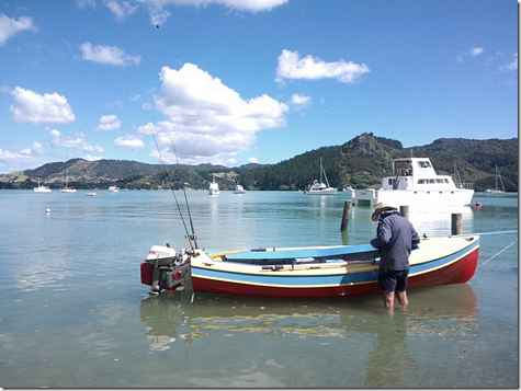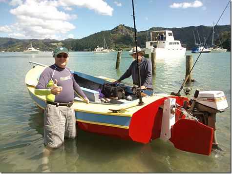 Well she floats - upright and on an even keel and best of all - NO LEAKS!!! Only a powered dinghy at the moment - no sailing rig done yet. She is very stable and tracks straight under power -very stable at anchor too. My brother John and son Benjie (who took the pics) came with me. We caught lots of fish on her first trip out but unfortunately none that were legal size so Chicken for tea. I do have a couple of issues with the centreboard and trailer but will get these sorted in the near future. After 7 years work ( I can't believe it took me that long) it is just good to see her in the water and everything ok.