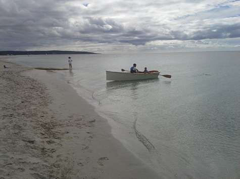 The goat Undine's second sea trial. Still under oars with brother in law at work in this photo. Geographe Bay, Western Australia