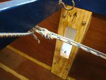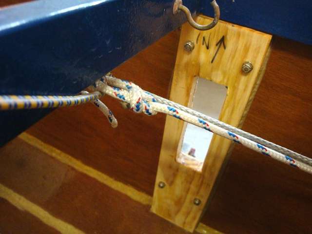 A picture being worth 1000 or so words, here’s a batch of photos showing exactly how and where the motor mount (a spare chunk of 2x6) is attached to my Slingshot 16 trimaran.