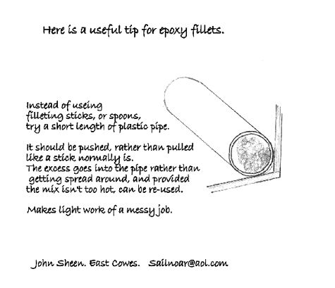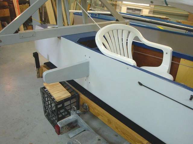 The problem, of course, is how to hook up a small outboard to a narrow boat whose transom is not only 7’ away from the only seat, but wouldn’t be sturdy enough to hold a motor in any case. Add to this the fact that the additional weight all the way aft could mess up the trim, and in any case, the motor’s tiller handle would be totally out of reach.