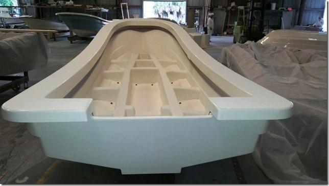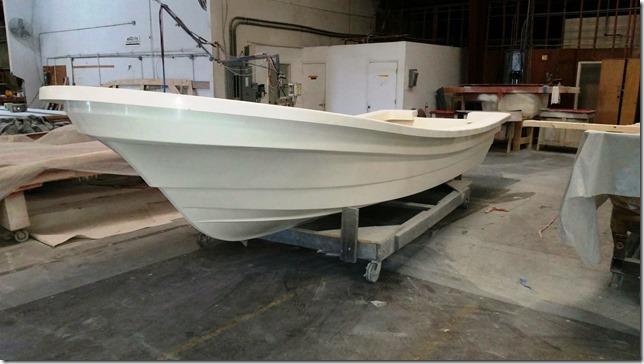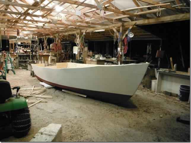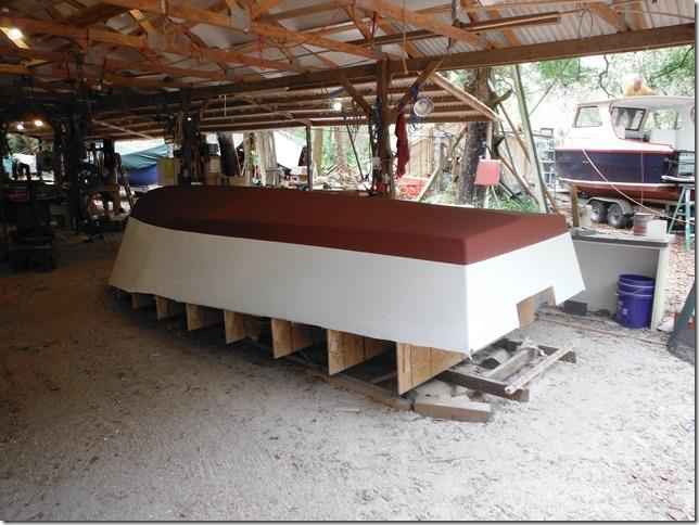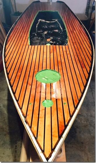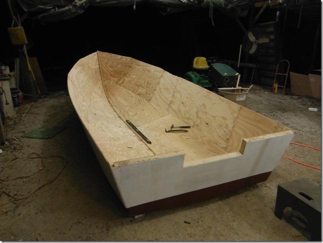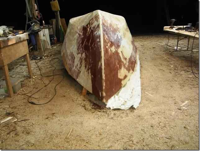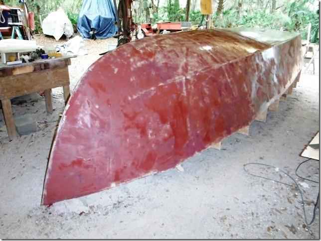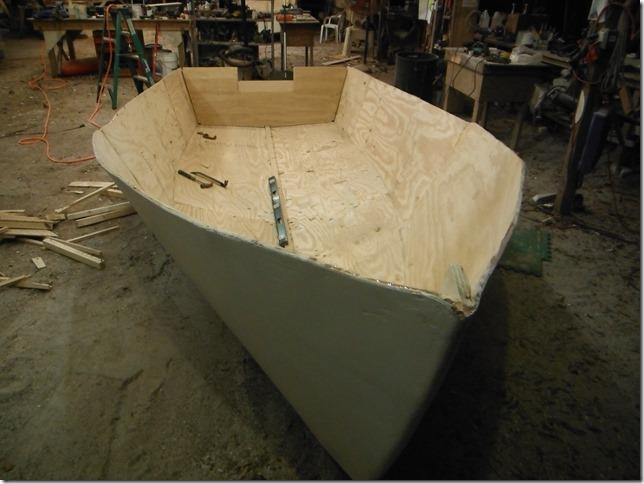 This thing looks just like a giant Core Sound, maybe I should put a big sail on it. All of this glassing and grinding and filling and sanding and sanding was a lot of work but as you know I actually like to sand if I can use power tools. All of this from start to finish took me just a week to do. I like to go out to the shop after dinner and work from about 7 to 9 which eliminates a lot of waiting for epoxy to dry if I do it during the day. Now to start the inside. More make it up as I go along.