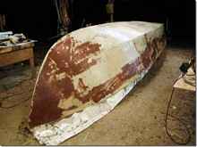 Now it's time to roll her over. This can be a complicated and scary operation for most hulls. You can lose control and they fall and crack or fall and squash you. That wasn't a problem with this one. Since it's so strong and overbuilt I just hooked a couple of straps on the strong back, clipped them to an electric winch up in the rafters and pushed the up button. I didn't tell the guys I was doing this, they were doing their on things and I'd rather screw up all by myself anyway, you know our one and only rule "don't even think about helping me", it you can't figure out how to do it by yourself you need to go back to school. Howard and Wally walked over as the hull was going up and when it got to the top tipping point Howard ask how I was going to keep it from crashing down and I yelled "I'm not" as I ran for my life out the end of the shop. The whole thing came crashing down with lots of crunching sounds as the molds and strong back ripped themselves apart. Steve was down on the beach with Red and heard the loud sound and busted out laughing, he knew exactly what was happening. Wally and I got a big sledge hammer and crow bar and bashed all of the internal structures out. There was no damage to the hull.