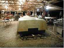 I'll make a few comments about boat building for those of you who may want to jump in and do one. Some parts are fun and some parts suck and no parts are easy. I know, I've always made it sound like there's nothing to it, the thing just jumps together. I won't even get into Traditional building where they don't use grinders and filler and everything has to actually fit together. That stuff is so far above my level of patience that I know I'd never get the first board in place. The one over riding activity you'll find yourself doing more than anything else is sanding. You saw the start of this one last time where I made the forms and bent the plywood around to fit. I did a little grinding but it was all pretty good. Then I started glassing, this is really a glass boat with a plywood core. I put one piece of 25 ounce cloth down the middle of the bottom and sanded the edges smooth the next day. Then I wrapped the same heavy cloth across the boat from gunnel to gunnel with a 12 inch overlap on each 4 foot wide piece of cloth to act sort of like frames. Then I had to sand the seams till they were smooth for the next layer. If you've never sanded fiberglass you're in for some fun. The tiny little glass dust gets all over you and itches (yes, fiberglass if real glass). It doesn't matter what you do it still gets you. It was still looking pretty good so I put the next layer on, this time the heavy cloth front to back overlapping a foot on the keel. After this layer was hard the next day and edges sanded I figured it was time to try to fix the bad places with filler. This brown looking stuff is filler using micro balloons and epoxy. It works pretty good and is easy to sand (easy being a relative term, how long can your arms and back hold out). Notice how pictures really distort some of the shapes.