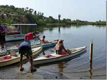 We had a bunch of visitors last weekend out off my beach playing with the foam kayaks. Steve was the lifeguard seen here in this thing he calls a C1. You have to strap yourself in to keep the water out; I doubt that's water he's holding in that cup. He did real good, no one was lost.