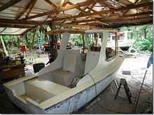 My fast commuter is not coming along worth a dam. After the first couple of week and the hull was done and deck started I was ripping right along. The cabin went on pretty fast but then I had to start painting; a screeching halt occurred. Water based paint WILL NOT dry when it 100% humidity, no way, no how. And epoxy does strange things also. You should see me out there with a hot air gun trying to get something to dry so I can get on with it. I can think Pat Johnson for the inspiration for his boat, he's a man who knows what he wants also.