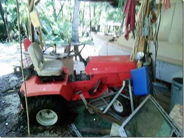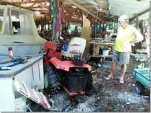 Here comes a story that you will absolutely, positively not believe. This can not happen in a million years. I was out working on my boat and noticed that the red tractor looked strange; this is what I saw. Some time during the night the Gravely had been started up, driven in a big circle in the yard, run over some saw horses and stuff, hit a shed pole and sat there running digging a hole till it's gas ran out. We all gathered around to figure it out and came to the conclusion that a ghost had to have done it. We never get any vandals out here at the end of the world and this machine isn't the easiest thing in the world to start and make go. We gave up on trying to figure it out till happy hour. We had moved it back out into the drive way and were sitting having a few cold ones when I heard it start up. I figured that one of the guys was doing something with it till Steve yelled, "holy shit, it started itself up again". All we can figure is that water got into the starter switch and shorted things out somehow. Why it would do it after sitting out on a sunny day is beyond me. It wasn't in gear this time so it didn't go anywhere but that did explain things, I guess. We got a new switch.