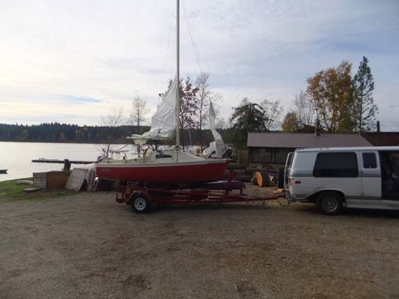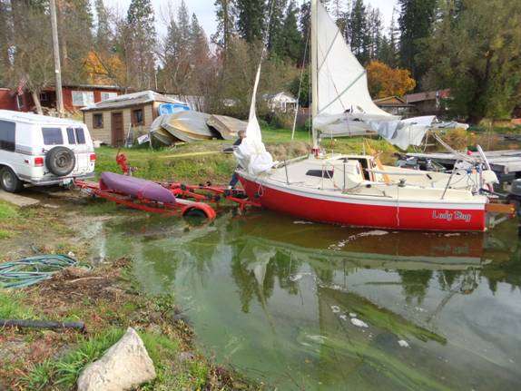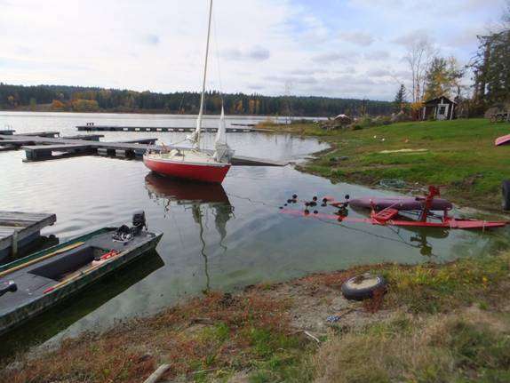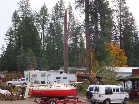 What had been one of those delightful moments we sailors search for, and cherish when we find, had been shattered just like the thousands of old growth pine trees no longer standing in the surrounding hills. Time to hyakko for the trailer! At least the motor had been tilted up when I did all that banging and crashing with the rudder.