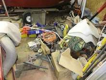 It’s inevitable that stuff will grow around the perimeter walls of any shop I occupy. Sort of like a bath tub ring. Pieces of plywood, chunks of logs for carving, outboard motors, even paint cans; and every now and again, this stuff has to be “brought under control.”