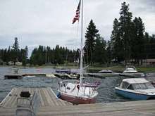 Lady Bug dressed for the Fourth of July. Two of the three dock units we move twice a year with a 15 hp short shaft 2-stroke are visible. Definitely a job for a proper tugboat.