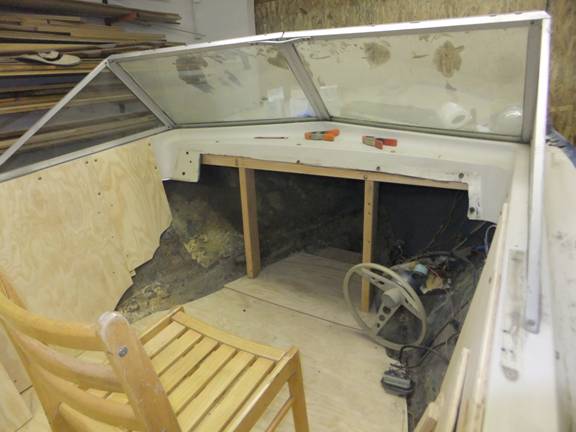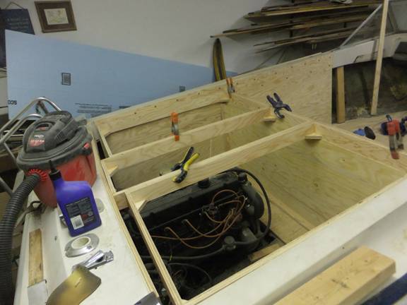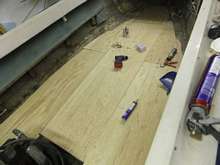 Yep, that's a floor jack under the seat. I still have to tweak the foredeck a bit to take 40 years of gravity-sag out. Dunno if there will be lift lids in the seat, or a drop-front panel. Probably lift lids and an angled seat back/full width cushions.