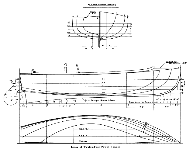 The boat is not designed for speed, as may be seen at a glance; her speed with two persons on board being about 4 1/2 to 5 knots. However, the plan shows smooth lines with a lean entrance and ample flare forward. The after forms have been made full, affording sufficient buoyancy to allow of the engine and all connected with it, including the operator, to be placed abaft the lazyback which divides the interior, leaving a seating space 4 by 5 1/2 feet clean and clear for passengers. This arrangement has the additional ad vantage of bringing all the weight aft when the tender is light and in tow.