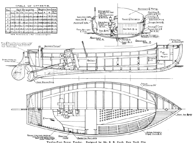 The plans on the accompanying page show the lines and general arrangement of a thirteen-foot power tender designed and built by Frederic S. Nock, of East Greenwich, R. I., for Dr. F. T. Rogers, for use on his yawl Truant. The owner desired a light power tender, of not over 300lb weight, to carry on davits and capable of carrying six persons besides the crew. In the majority of the small power tenders, the engine is placed aft, and there fore the best of the boat is rendered useless as far as seating accommodations are concerned. Where the engine is not of any great weight the arrangement as shown is good, as it keeps the after part of the boat for the guests and forward for the crew. This boat was not designed to be towed astern of her consort and the weight of the complete boat is a trifle under 225 Ib. The planking is 3/8 in. cedar, the gratings, seats, sheerstrake, mouldings, etc., of mahogany.