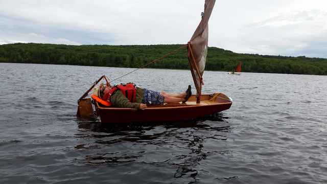 Thorn is an 8 foot arc bottom boat that you can row or sail. He’s built the seating to run down the centre line of the boat kind of like a long box. Inside the seat it is set up to house batteries to power an electric outboard. Apparently, the seat is a good single bed too … check out “Mr. Relaxation”.