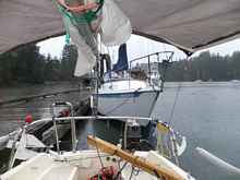 The party broke up on Sunday morning to the backdrop of forecasts for heavy rain, gale-force winds against the strong ebb, and otherwise less than satisfactory conditions for sun bathing. Tom and "Reset" had possibly the worst of it. It's a 30-mile point to point run for him in a boat with a flat water speed close to a brisk walk in the park. What he ran into was anything but a walk in the park! With an inflatable dink in tow and rain blowing sideways, he had his bow anchor slip its chocks in the Tacoma Narrows. Gusts blowing above forty had pushed the outgoing tide into quite the confused and breaking stuff that stretch is known for. The bad news is there wasn't anybody there to get pictures of Tom out on a bow alternately diving under water and lurching for the sky, retrieving a Danforth on chain rode before it managed to anchor him just where he would never want to be anchored.