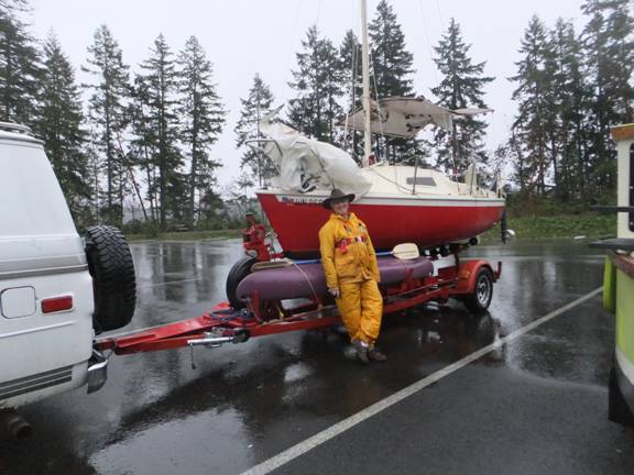 I was sitting in a truck park someplace between Vantage and George. The wind was howling, and my little wagon train was bucking and jouncing on its springs. I had my last pair of almost-dry socks on. Willie and Waylon were serenading me on a small town country oldies station. I was down to a couple hundred miles from home on a week-long, 850-mile odyssey. Just about everything about this trip had gone wrong, counter to the plan; even the weather man had got just about every prognostication wrong. I had serious mechanical troubles that took a serious time delay and serious cash to remedy. It had rained an inch over the prior record for that day, in a place that is just about the rain capital of the country. The light winds forecast had manifested into a maelstrom against the ebb tide. It was dark, cold, and windy up there on the back side of the Cascade mountains. Unless I wanted to dig wet sails, a clammy sleeping bag, sodden mattress, and whatnot out of Lady Bug's cabin up on that rocking and reeling trailer first; I was gonna' have to settle for the ramen noodles and instant coffee I could lay my hands on, in the van.