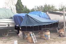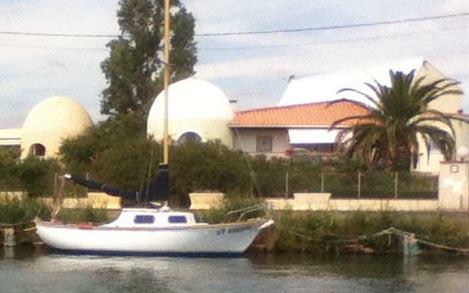 Parked K. O. T. W. on the hard at Alleman's boat yard in Agde, France on the Herault River a few kilometres from the Med. The winters are mild here, even though we are north of Maine in latitude, so I'm hoping my little boat will weather the 6 or so months until I return.