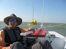 Rick also lost his rudder. Chuck Pierce comes up (CP is the current president of the T200 Board and the leader of the PDR’s cancer funding campaign,) and tries towing rick in his PDR! Wow that man has balls of steel. Anyway, Chuck P. capsizes. And His mast stuck right in the bottom of the bay and snapped off. We have gone from suck to blow! You remember the guy from the Princess 22? Travis Votaw I believe is his name. His son was with him too. Anyway, Rick goes off with another boat who can tow him and gets sea sick for 90 minutes and Travis’s son jumps in to help Chuck. With both they’re weight they right the boat. They take the broken mast and start shaving the stump down so that it will fit in the mast step. It takes a while but Chuck finally got everything ship shape and was able to head on. He lost a lot of equipment of course. But he says he looked at the names on his boat of everyone who had succumbed or beaten cancer and knew they had gone through much worse, and Chuck carried on crossing Red Fish Bay.