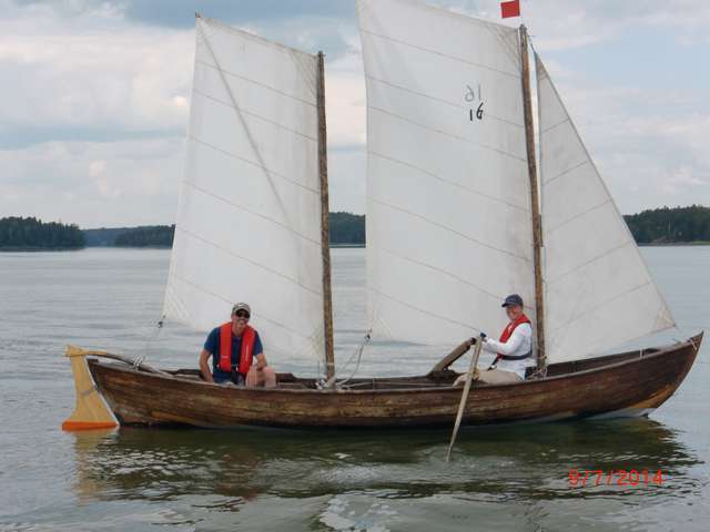 - Mats Vuorenjuuri's 14 ft Herreshoff Coquina lug-rigged cat boat. Mats and his son, Verneri, comprised one of three Finnish crews. He is a Herreshoff fan and, amazingly, acquired his beautiful unusual boat from a retired farmer in central Finland.