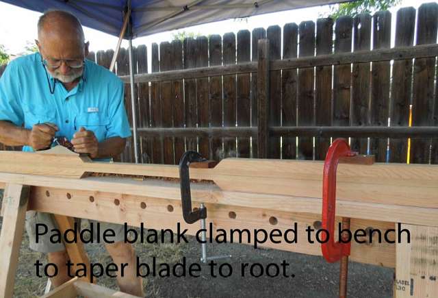 (see Grain Orientation Detail illustration) with no run-out and no knots in the "usable area". My approach requires lots of rip cuts into long skinny pieces that are glued-up into blanks. I use only Gorilla Glue, the brown stuff. It requires lots of clamps but dries in less than 2 hours and make an excellent waterproof bond. I soaked a cut off end part of a paddle with 4 layers and 3 glue joints in water for several days and the glue joint was stronger than the wood. The piece I soak tested was very similar to the drawing in the "Grain Orientation Detail" illustration.