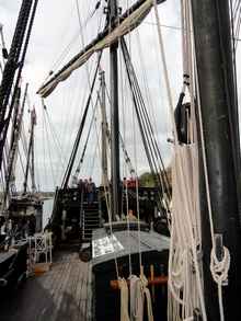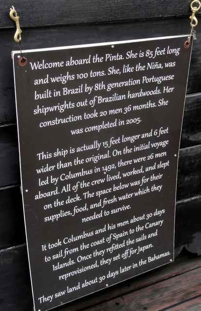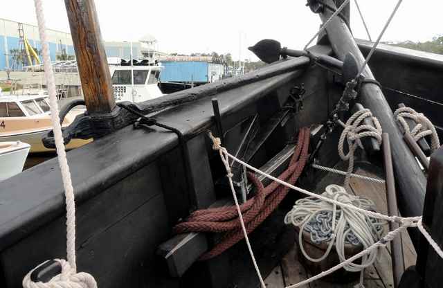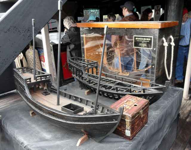 Looking around the boat, a lot of smart choices have been made. While the setup is traditional, the sails, for example, are modern Dacron fabric. Most of the ropes appear to be three-strand Dacron, which look the part but cut down the maintenance. A wood-stocked fisherman-style anchor is on the gunnel on the foredeck. Tucked discretely under the rail below it is a black-painted Danforth type. There are unobtrusive wire stays, parcelled and served, holding up the mainmast. Pictures, posters and exhibits are sensibly placed around the ships to help explain its history and workings and the way of life. And a small ships store is tucked into Pinta's covered stern deck.