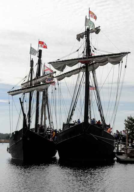 The curious, in jackets, t-shirts and bright colors, flowed over the decks of the two black-hulled ships, the most colorful bits on a day when the sun only peeped through the clouds. They waited, sometimes two or three hours in line, for a chance to see these two replicas of history, traditionally constructed presentations of the Nina and Pinta, two of the three ships Christopher Columbus sailed on his discovery voyage to the New World.