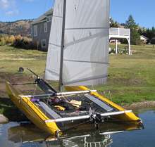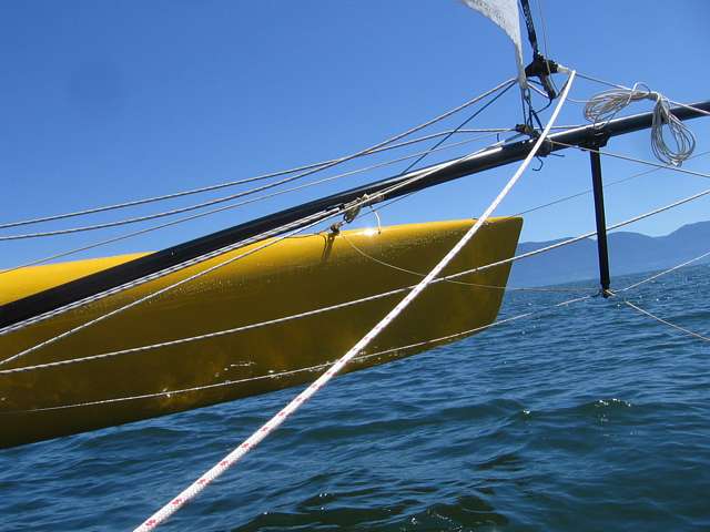 Normally she'll lie there on her side while we scramble onto the lower hull and hook into the righting line. But that sucker lull is long gone now, and 20 kts of breeze pounding on the tramp rapidly drives the mast into the lake and the boat turtles, completely inverted, before we get into position to right the boat. Turns out she's a mighty stable platform upside down, even in this building sea. We're in dry suits, so personal safety's not an issue. But getting her righted before we drift ashore and that 40 mast finds the bottom is a high priority. It's now blowing in the high 20s with increasing chop, it's mid October and there's nary another boat on the lake. We spend some time and precious energy attempting to pull her up from turtle, but the 12' beam that makes her so stable pointy end up, now performs similar duty now keeping her inverted. Out comes the cell phone, to acquaint us with how many of Brad's numerous boating buddies have pulled their boats for the year. With the best offer of assistance being hours away, we once again put some muscle into doing the job ourselves. The boat has altered it's orientation to the wind, and somewhat surprisingly we get her onto her side, but can't quite pop her back upright. Big windage now, and with the sails substantially less immersed, we're drifting ashore rapidly. And a formidable shore it is, big rocks with a three to four foot swell pounding it. And we've got to stay on the righting line to keep her on her side, or the mast responds to gravity again.