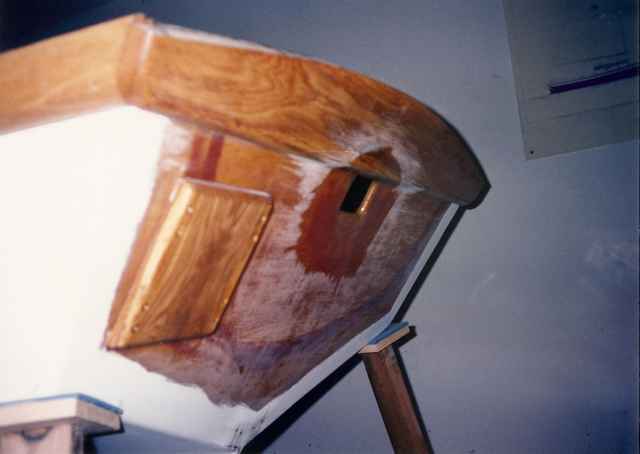 The plans called for the usual cutout along the top of the 1/2 inch plywood transom for the tiller to pass over, but I liked the idea of continuing the coaming along the top edge of the inside of the transom, and the rubrails along the top edge of the stern. I also thought the transom should have a doubler along its top edge, so it got one inside and out. Much more weight way aft, but it's really strong and looks nice.