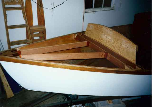 In 1999 I kept her in a slip at Boulder Marina on Carlyle Lake, IL, during the summer and fall. Apparently the heat, humidity and the way I had mounted a cockpit cover in the oarlock sockets caused the coamings to come loose near the center of the cockpit. So I re-epoxied the gaps and clamped the coamings neatly back into position, then added bronze screws there also. The rest of the boat is completely fastened with epoxy - no other screws except to mount hardware.