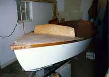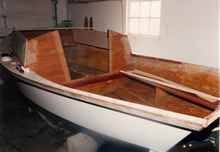 A layer of 6mm okoume was added to the outside of the 1/2-inch fir cabin front, to match the rest of the cabin and add more weight. This was a very good idea, but it would have been better to simply use okoume in the first place. The decks and cabin top were later painted cream, and the cabin front and sides left bright. |