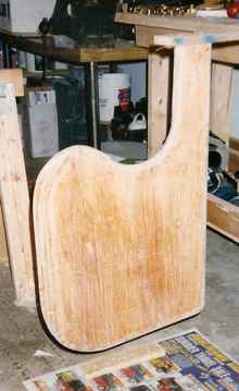 The guides for the drop boards are roughed-in, and you can also see the top trim of the daggerboard trunk roughed-in. The drop board guides were pre-shaped before they were glued-on, but the daggerboard top trim was glued-on somewhat rough, then shaped in place, to make sure it was faired into the trunk, and where it met the drop board trim along the main bulkhead. |