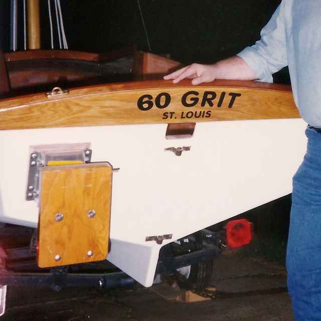 The Cartopper had suffered, from close-up anyway, from a distinct lack of sanding. I also had done very little wood-working while building her, having found most of the wood sized as needed at lumberyards, such as the 1x2's to frame the transom, and the wooden poles for the mast and sprit. I also used a popular and colorful oil-based paint, which did not adhere well over the epoxy.
