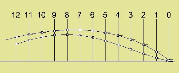 Next, we need the half beam or Y. The table shows the “half breadths” for the sheer, as 4-6. In engineering units: 48+6 = 54”. Y = 54. Let's enter the points of station 8 in the modeler. We will use keyboard entry in x-y-z. 172,54,37. (No decimals in this case). All 3D modelers will let you enter 3D coordinates as above but you can also draw the points graphically. Let's draw another point, the chine at station 8. Height: table shows 0-3-1/2 (note the leading zero) This time Atkins measures height from the baseline! Width: 3-10-3/4+. Y = 36” +10-3/4 = 46.75 In XYZ: 172,46.75,3.5. Now we have the two points that define the hull at station 8. Let's create the points for all the stations, one by one and join the points by a curve, one for the chine and one for the sheer. Those lines have kinks resulting from the scaling imprecision. We must fair the lines. Most 3D modelers have fairing tools, use them and try to stay as close as possible to the original points.