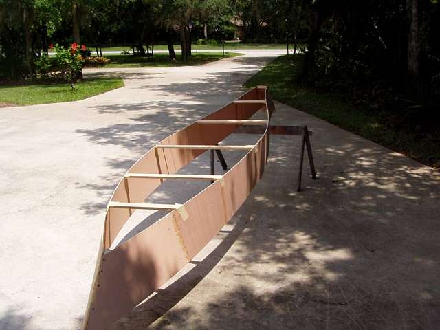 The sides and bottom are of Home Depot Lauan plywood. The stem is a 2 x 2. The transom is of heavy plywood. I was trying to keep the weight at a minimum plus I am very frugal and try to use what is available.