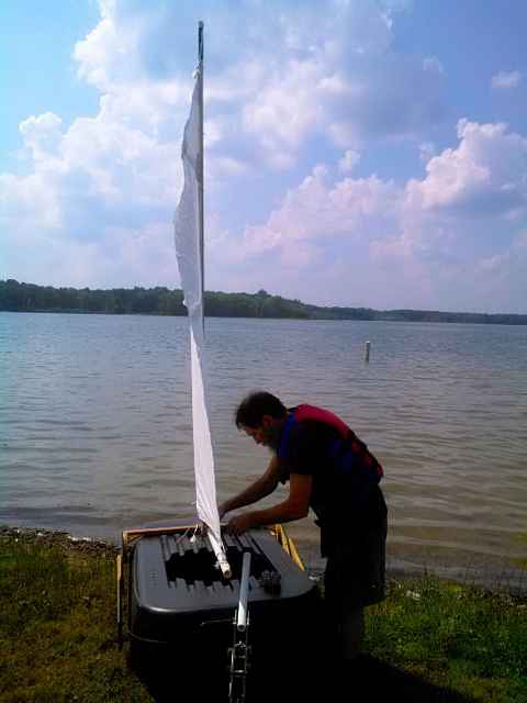 Carrier moved well and could be headed on a reach fine in the really light air. Craft showed promise of better performance with the improvements list checked complete, and some real wind. Not bad for a first time design! I could have confidently crossed the lake's mile, and returned on a downwind run. |