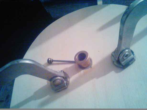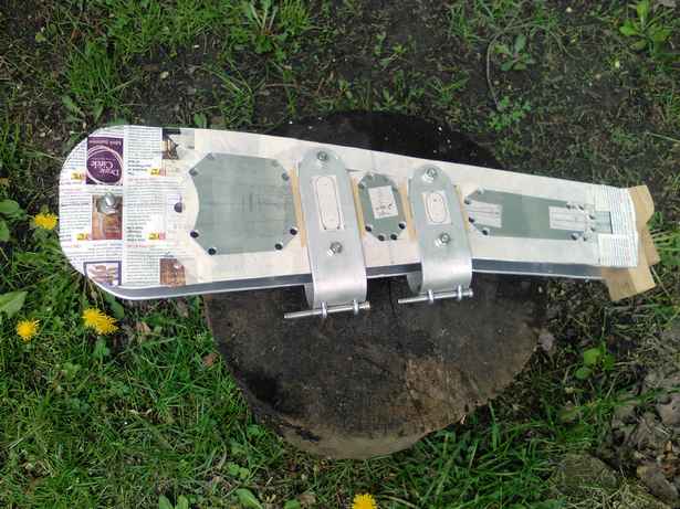 Finished rudder. Aluminum pintles with stainless steel bolt pins, cable clamp U bolts holding. PVC tiller.