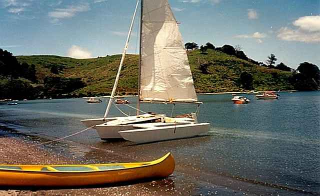 Early next morning a gentle sea breeze arrived, the sky clear, breakfast over with, stowed all loose gear below, on with my life jacket, hoisted mainsails, down centreboard, up anchor, out with Genoa furler, sheets in and off we went at a nice little clip. Our destination Kawau Island about four – five hours sail away depending on wind strength. Interesting to note that once the sails had been tuned I found our little cruiser well balanced with steering to be at finger-tip-light, so as an experiment used a bungee cord placed over the tiller (not around it) attaching it to both starboard and port cleats. Amazing really as she held her given course thus relieving me so I could grab a bite to eat or read a magazine whilst keep a watchful eye for shipping from the cockpit. Around mid-afternoon the wind died altogether leaving us in a flat calm sea with a slight swell from the east, my destination I could see was only about two miles away so out came our canoe paddle and away we went paddling whilst I’m sitting astride one of the amas/floats. This continued until almost dusk when another breeze arrived. At last we were moving again approximately 8 - 10 knots from the east arriving in Bon Accord Harbour just as the sun was setting. Lesson learnt; get a small outboard motor and fit navigation lights the latter I was worried about if caught out at night again.