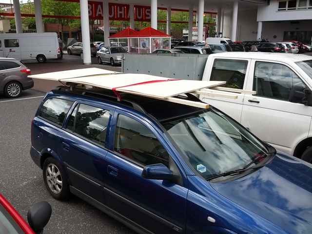 Two sheets of 6mm ply and one sheet of 4mm ply loaded. Used three pieces of 2x3 as a load spreader. Should have put the 4mm sheet into the middle of the stack - the wind load pulled one corner of the 4mm sheet up and kinked it slightly where the tiedown strap sat. |