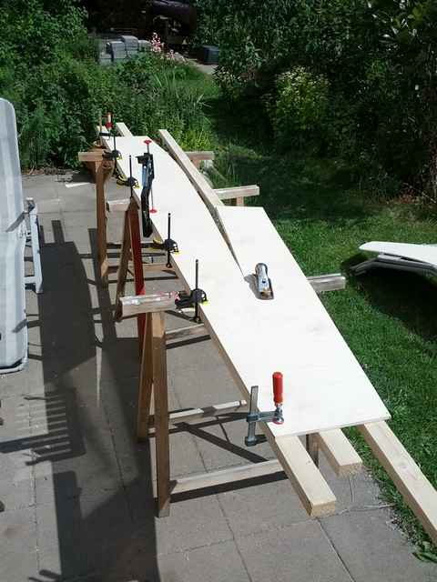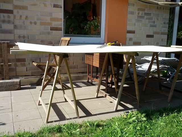 Sheet with the 2x3 support battens on sawhorses ready for first cutting. |