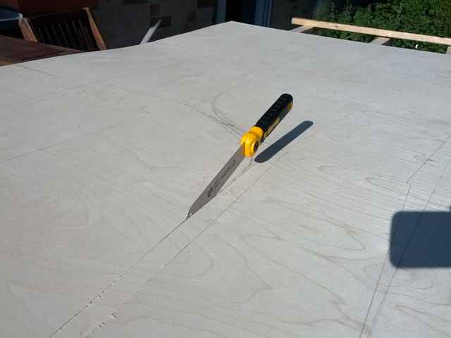 Used a very thin bladed (I guess 0.8mm) imitation Japanese pulling saw for all cuts. On long cuts, the blade tended to jam quite a bit. After a while I figured out that it helps a lot to slightly lift one side of the ply behind the cut with one finger of the non-sawing hand (mimicking a scissor cut). This gives the blade just the right amount of extra room. |