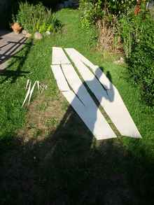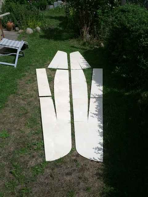 I had also been considering to try out Flo-Mo's "Flywood" one-sheet canoe with its intriguing and beautiful design. The store did have a sheet of 4mm ply, so that decision was taken for me = the canoe it was as my first project. I still purchased the two sheets of 6mm just in case, to make sure that I will continue and also do the Robote. I should probably remark at this point that the finished forms for Robote have been sitting in my basement for two years, and the oars have been in "almost-finished" shape for nearly a year now. I have also built cardboard scale models of both the Robote and the Flywood canoe. Still, I had those three days (well actually not three days, but a fixed "fully free" timeslot during three consecutive days) and wanted to make as much headway as possible on one boat, so here goes.